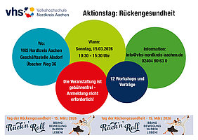 Am 15. März ist der bundesweite Tag der Rückengesundheit - und die VHS Nordkreis Aachen ist dabei! An diesem Sonntag bietet die VHS Ihnen ein vielfältiges Programm aus Übungsstunden, Vorträgen etc. rund um das Thema Rückengesundheit. Fitness- und Yogalehrer*innen, Expert*innen aus den Bereichen Ernährung, Phyto-, Physio- und Psychotherapie geben hilfreiche Tipps bzw. Sie können in Probestunden unterschiedliche Bewegungsformen ausprobieren. Alles mit dem Ziel, Ihren Rücken zukünftig zu stärken. Und wer eine Pause benötigt, auch hier gibt es Angebote. Das ausführliche Programm finden Sie hier bzw. mit Klick auf den Flyer.
